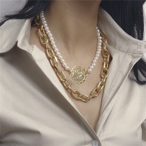パール ビッグチェーン2連ネックレス コイン ヴィンテージ 韓国アクセサリー